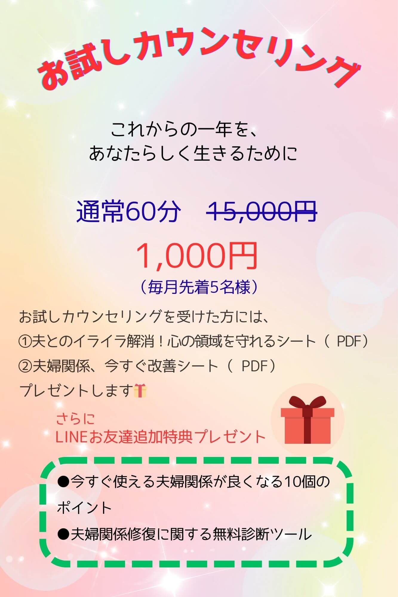 話の内容によっては、セッションの時間が延長することもありますので、ご予約の際は時間に余裕をもってきてください。(初回の延長は無料です)